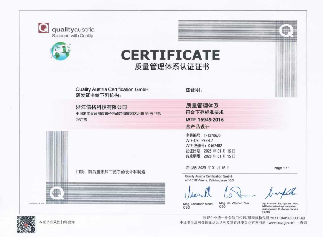 浙江信格科技有限公司(原台州市重发汽车部件有限公司),坐落于经济发达的沿海开放城市台州市路桥区,水、陆、空交通十分便捷,公司创建于1995年,是一家专业从事汽车门锁开闭件系统、点火锁、机罩锁、行李箱锁、内外拉手、拉索等锁系统等汽车配件的研发、生产、销售的企业。